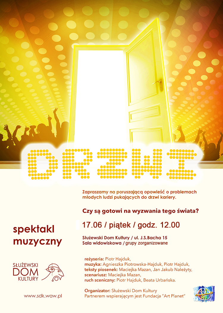 RODZINNY SPEKTAKL MUZYCZNY Zapraszamy na poruszającą opowieść o problemach młodych ludzi pukających do drzwi kariery. Czy są gotowi na wyzwania tego świata? Pokaz dla grup zorganizowanych, rezerwacje: j.zielinski@sdk.waw.pl