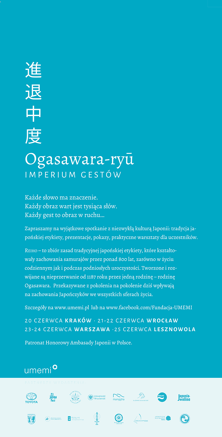 Prezentacja zasad Reiho, tradycyjnej etykiety japońskiej, warsztat z udziałem publiczności. Imprezie towarzyszy pokaz i poczęstunek herbaty japońskiej – Stowarzyszenia Urasenke oraz kitsuke - sztuka zakładania i noszenia tradycyjnych strojów japońskich, kimon i yukat w wykonaniu grupy Yorokobi no kōen. Wydarzeniu będzie towarzyszyć wystawa bonsai - japońskich drzewek. Będzie to okazja do znalezienia odpowiedzi na wiele pytań i poznanie ciekawych, mało znanych elementów japońskich tradycji kulturowych. SDK/bezpłatne wejściówki - wydawane 1 h przed pokazem (od g.16.00 przed salą widowiskową SDK)