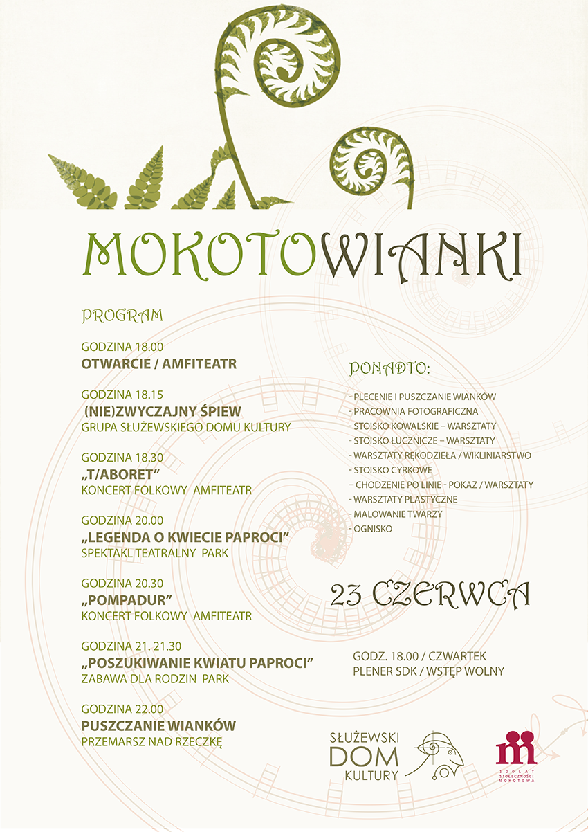 Jak co roku zapraszamy na obchody tej niezwykłej nocy. W programie koncert pieśni ludowych, nauka tańców, spektakl teatralny, animacje dla najmłodszych, poszukiwania kwiatu paproci (gra dla dzieci), stoiska warsztatowe i sprzedażowe, a na zakończenie wspólne ognisko i puszczanie wianków.Plener SDK/wstęp wolny
