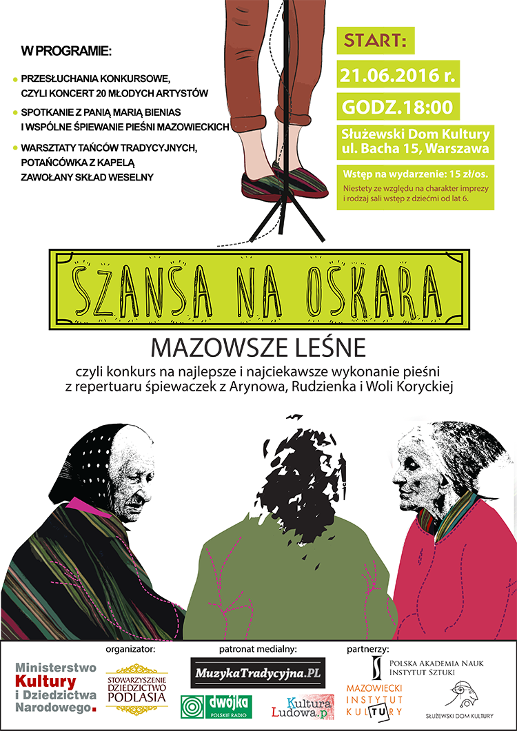 „SZANSA NA OSCARA 2016 – MAZOWSZE LEŚNE” - koncert i potańcówka. Konkurs śpiewaczy, koncert, warsztaty tańców tradycyjnych i potańcówka z Kapelą Niwińskich. Zapraszamy wszystkich miłośników tradycji na wyjątkowe spotkanie z muzyką Mazowsza. Projekt jest realizowany przez Stowarzyszenie Dziedzictwo Podlasia. Więcej informacji: www.podlasie.orgSala widowiskowa/bilety 15 zł (wstęp dla dzieci od lat 6), godz.: 18.00 - 22.00