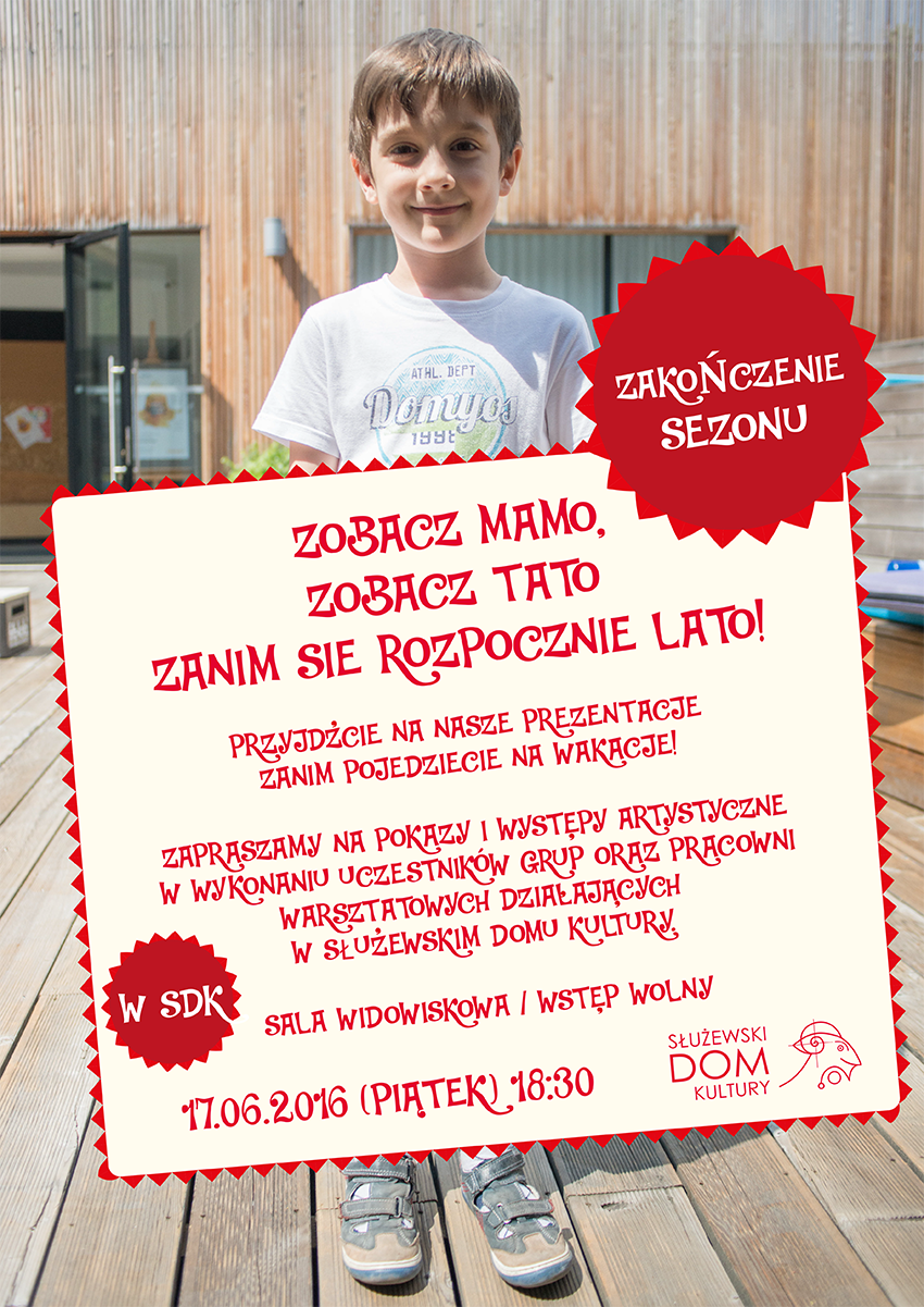 Zobacz Mamo, zobacz Tato zanim się rozpocznie lato! Przyjdźcie na nasze prezentacje zanim pojedziecie na wakacje!Zapraszamy na pokazy i występy artystyczne w wykonaniu uczestników grup oraz pracowni warsztatowych działających w Służewskim Domu Kultury.Sala widowiskowa/wstęp wolny