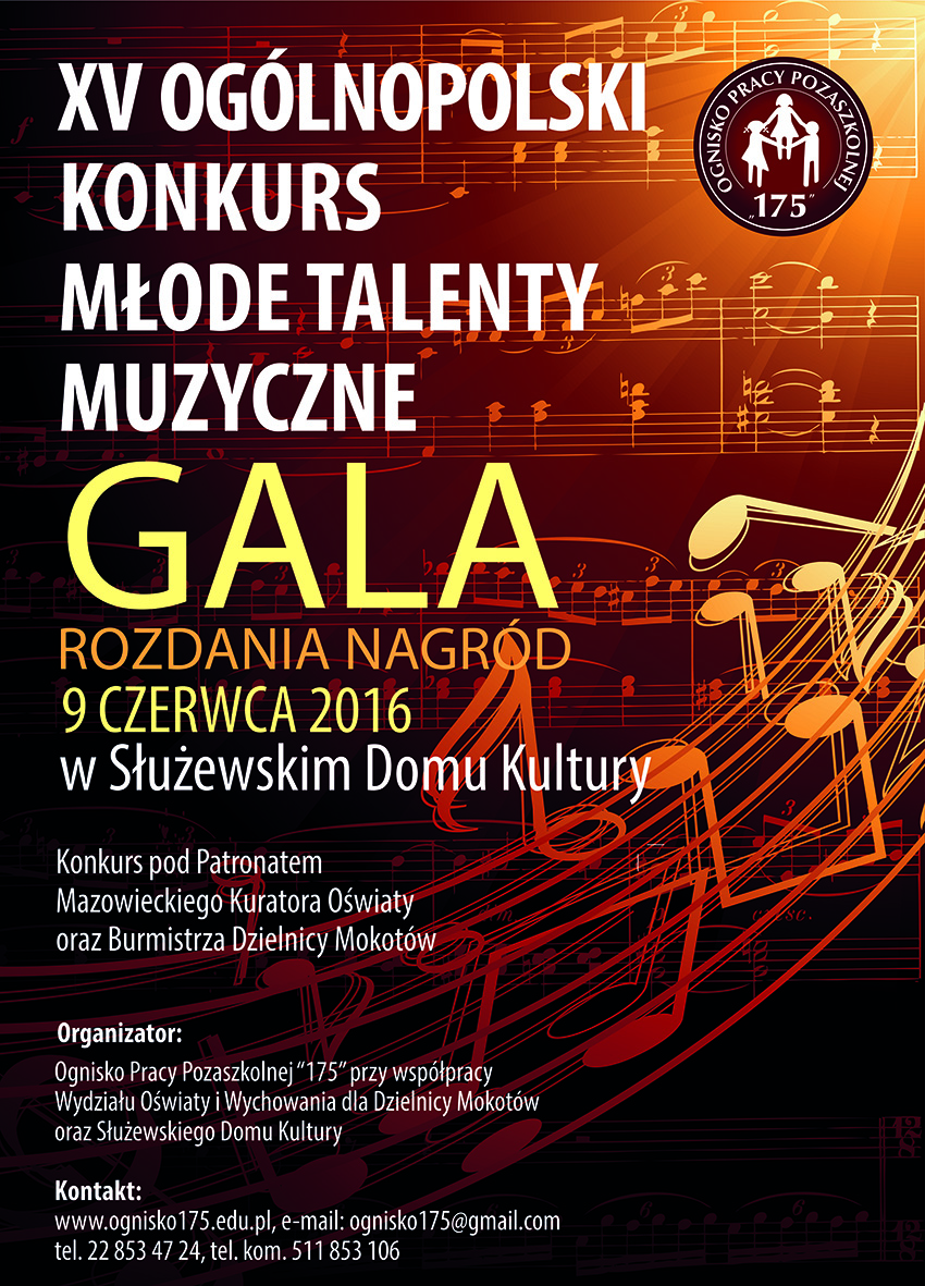 GALA POKONKURSOWA konkursów o zasięgu ogólnopolskim i wojewódzkim pod patronatem Mazowieckiego Kuratora Oświaty i Burmistrza dzielnicy Mokotów organizowanych przez Ognisko Pracy Pozaszkolnej „175”. Wydarzenie uświetnią swoimi występami laureaci konkursu muzycznego.Sala widowiskowa/wstęp wolny