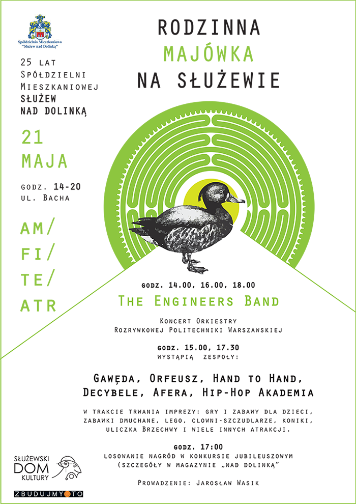 Rodzinna Majówka na Służewie. Zapraszamy wszystkich mieszkańców Służewa (i nie tylko) na doroczny festyn. W programie atrakcje dla małych i dużych, występy zespołów działających przy SDK. To także wspaniała okazja, żeby spotkać się z sąsiadami.Amfiteatr osiedlowy, okolice Bacha 22, g. 14.00-20.00/wstęp wolny