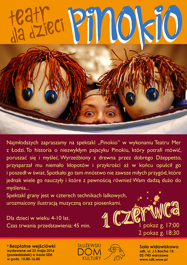 DZIEŃ DZIECKA W SDK. Najmłodszych zapraszamy na spektakl „Pinokio” w wykonaniu Teatru Mer z Łodzi.To historia o niezwykłym pajacyku Pinokiu, który potrafi mówić, poruszać się i myśleć. Wyrzeźbiony z drewna przez dobrego Dżeppetto, przysparzał mu niemało kłopotów i przykrości aż w końcu opuścił go i poszedł w świat. Spotkało go tam mnóstwo nie zawsze miłych przygód, które jednak wiele go nauczyły i które z pewnością również Wam dadzą dużo do myślenia...Spektakl grany jest w czterech technikach lalkowych, urozmaicony ilustracją muzyczną oraz piosenkami.Spektakl zrealizowany przez aktorów Teatru MER.Adresowany do młodszej widowni dziecięcej ( 4-10 lat)Czas trwania przedstawienia: 45 min.I pokaz g. 17.00 BRAK WEJŚCIÓWEK!II pokaz g. 18.30 BRAK WEJŚCIÓWEK!Sala widowiskowa/bezpłatne wejściówki wydawane od 23 maja 2016 (poniedziałek) w kasie SDK w godz. 10.00-16.00