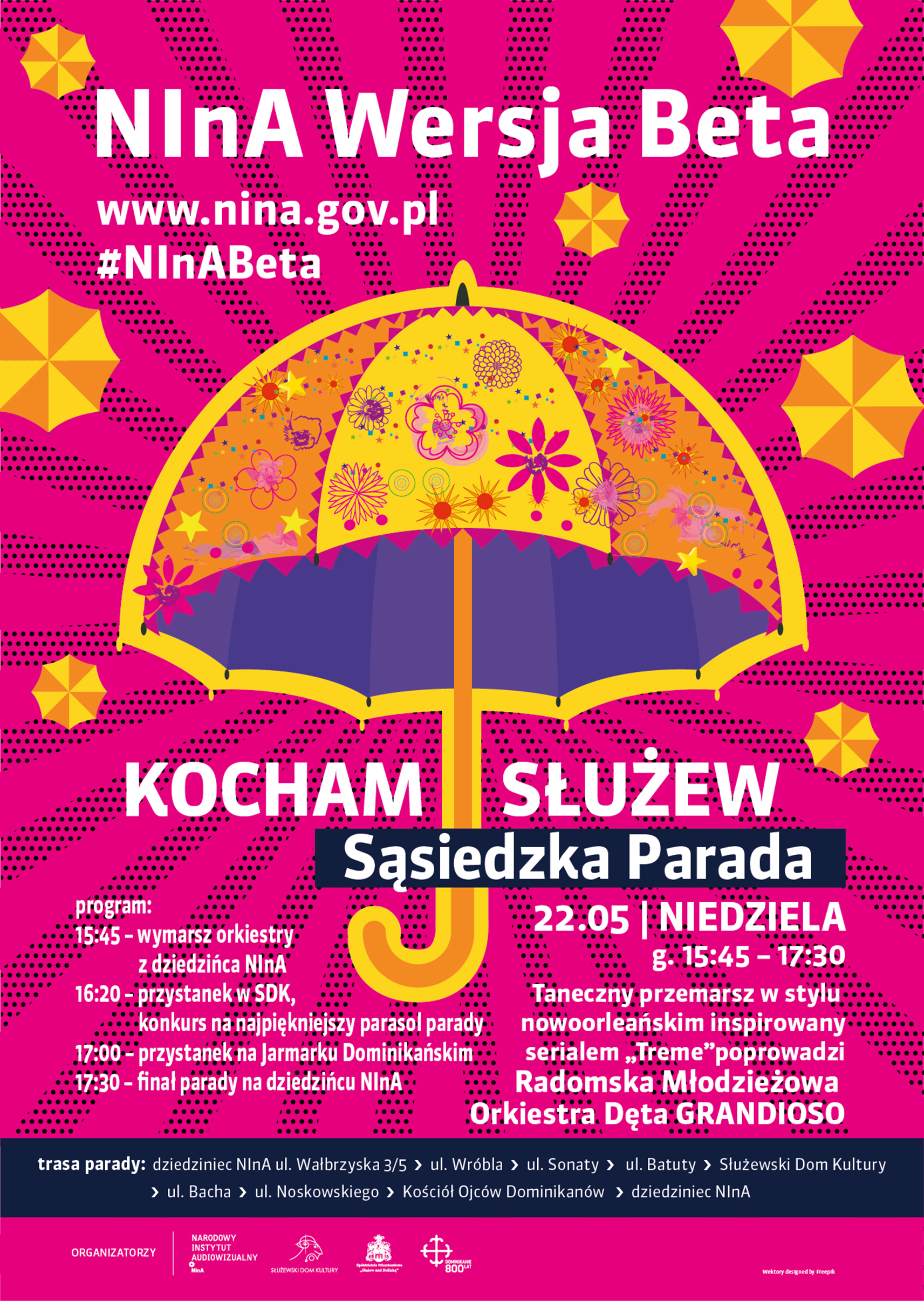 PARADA SĄSIEDZKA "KOCHAM SŁUŻEW!". Narodowy Instytut Audiowizualny zaprasza wszystkich na taneczny przemarsz ulicami osiedla! Naszą inspiracją będzie pierwszy odcinek serialu „Treme” w reżyserii Agnieszki Holland i porywające nowoorleańskie rytmy. Obowiązują tylko trzy zasady: taneczny krok, parasol w dłoni i dobry humor! Muzykę na żywo zagra Młodzieżowa Orkiestra Grandioso z Radomia. Program parady:15:45 – wymarsz orkiestry z dziedzińca NInA, ul Wałbrzyska 3/516:20 – przystanek w Służewskim Domu Kultury, konkurs na najpiękniejszy parasol parady17:00 – przystanek na Jarmarku Dominikańskim17:30 – finał parady na dziedzińcu NInA