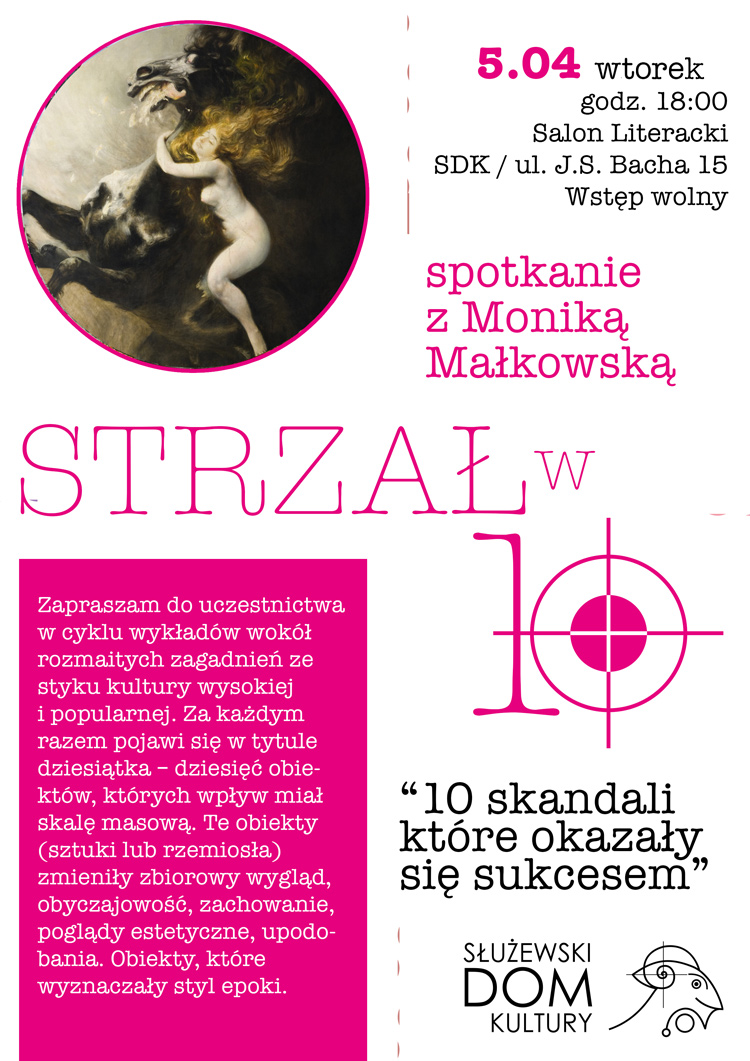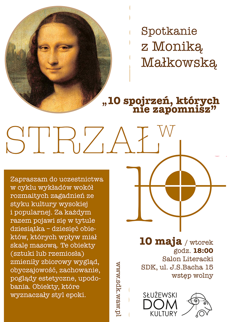 SPOTKANIE AUTORSKIE z Moniką Małkowską. „10 spojrzeń, których nie zapomnisz“ to nasz temat na zamknięcie sezonu. Zastanowimy się, dlaczego ludziom coraz trudniej przychodzi nawiązywanie kontaktu wzrokowego, zajrzymy w oczy m. in. Mona Lisie, Rembrandtowi czy bohaterom „Śniadania na trawie“ Maneta.Sala widowiskowa/wstęp wolny