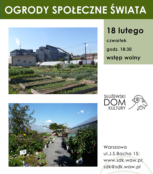 Wykład poświęcony ogrodom społecznym świata. Po prezentacji: berlińskiego ogrodu Prinzessinnengarten; barcelońskiego Can Masdeu; amerykańskiej farmy miejskiej w Milwaukee; oraz inicjatyw warszawskich przyjrzymy się ogrodnictwu i rolnictwu miejskiemu w Kanadzie. Domek literacki/wstęp wolny.