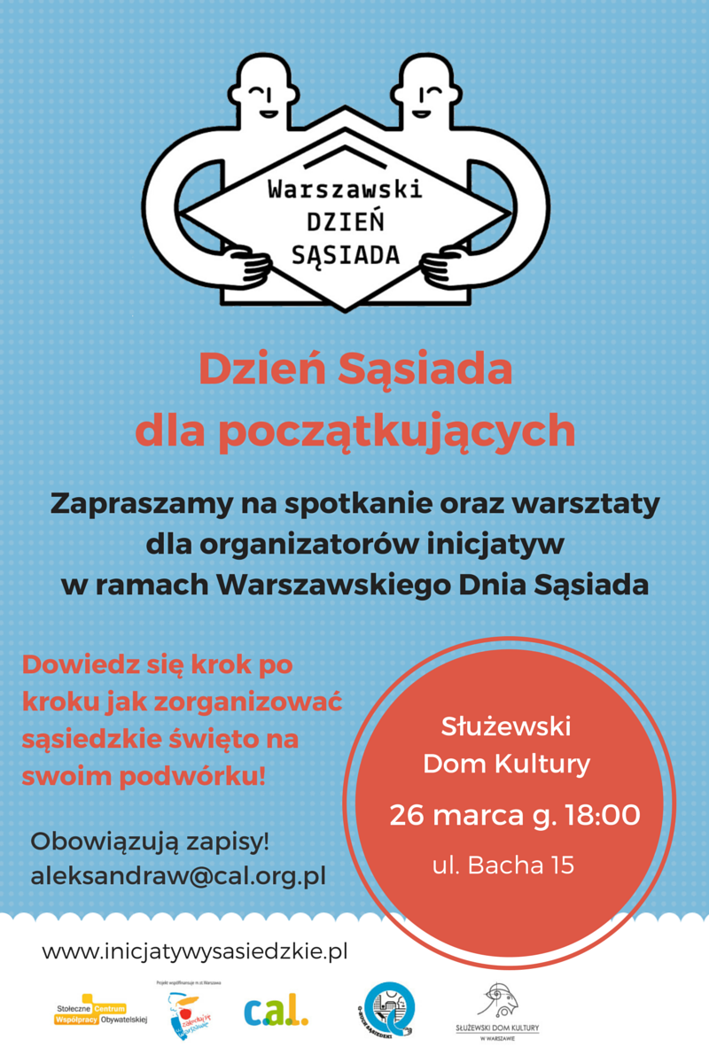 Zastanawiasz się jak zintegrować sąsiadów? Podoba Ci się idea Dnia Sąsiada? Chcesz zorganizować inicjatywę sąsiedzką? Zapraszamy na spotkanie i warsztaty „Dzień Sąsiada dla początkujących”! Na spotkaniu można będzie dowiedzieć się jak zorganizować taką inicjatywę w swoim sąsiedztwie. Bedzie można uzyskać praktyczne wskazówki jak działać krok po kroku oraz poznać innych organizatorów sąsiedzkich wydarzeń. Opowiemy także jak wyglądał Dzień Sąsiada w poprzednich latach oraz poinformujemy o przygotowywanym wsparciu dla organizatorów w tym roku! Spotkanie odbędzie się w czwartek 26 marca o godz. 18:00 w salonie literackim SDK. Ze względu na ograniczoną liczbę miejsc, bardzo prosimy o mailowe potwierdzenie uczestnictwa w spotkaniu na adres agatak@cal.org.pl lub aleksandraw@cal.org.pl
