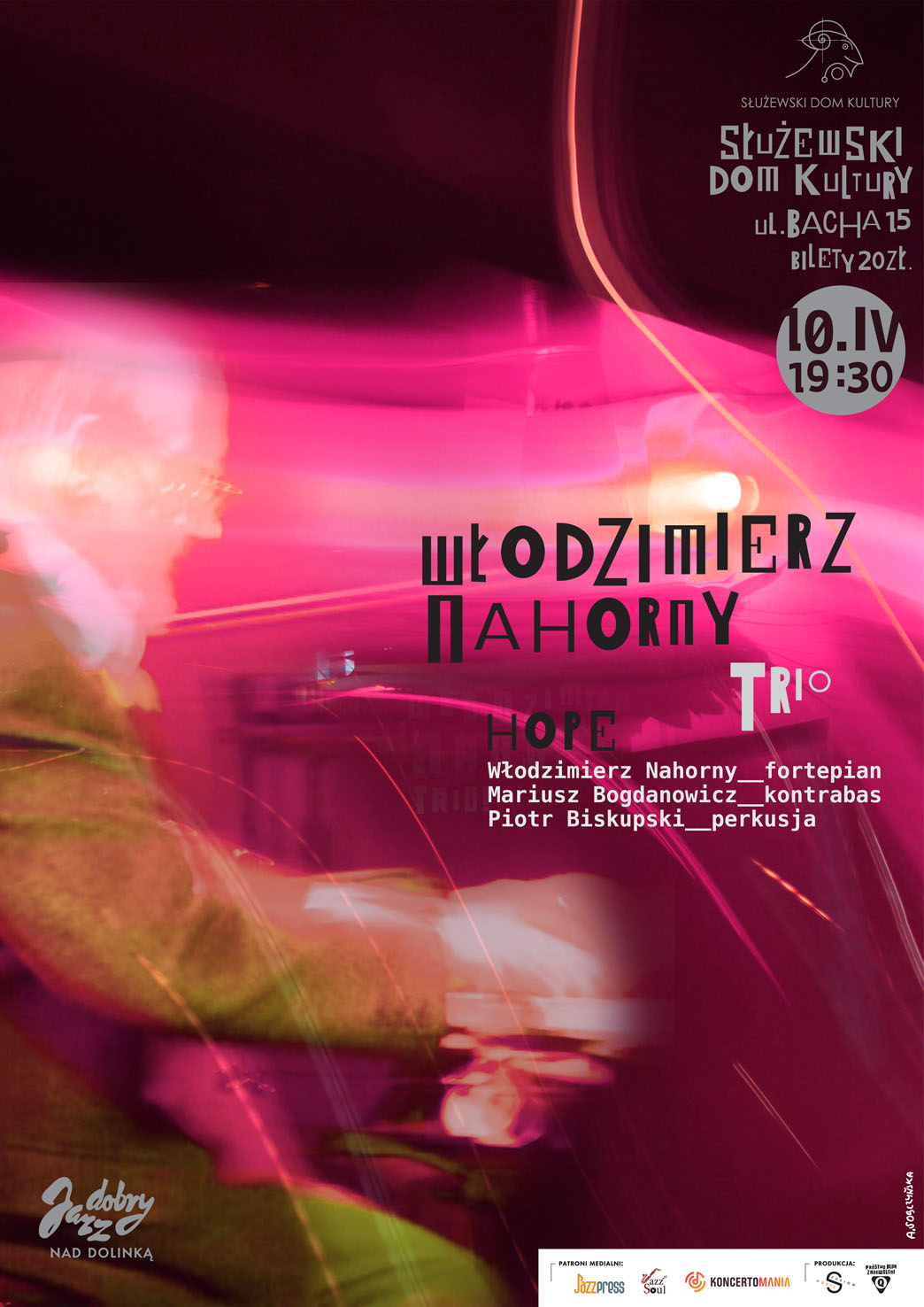 Zapraszamy do Służewskiego Domu Kultury przy ul. Bacha 15 na kwietniową odsłonę cyklu Jazz Dobry nad Dolinką. 10 kwietnia o godzinie 19:30 wystąpi Włodzimierz Nahorny Trio "HOPE".Charakter muzyki komponowanej przez Nahornego, pomimo, że utrzymany w kanonie klasycznego tria jazzowego, nosi romantyczne i słowiańskie piętno. Włodzimierz Nahorny Trio "HOPE" Włodzimierz Nahorny - fortepian Mariusz Bogdanowicz - kontrabas Piotr Biskupski - perkusja Bilety: 20 zł. / Sala widowiskowa. Tu: przedsprzedaż biletów on-line ; ; Bilety dostępne bezpośrednio w kasie księgowości na TYDZIEŃ przed planowaną imprezą -ul. Bacha 15; budynek administracji - poziom 0 (wejście z poziomu ulicy); kasa czynna pon-pt w godz 10.00 -15.00