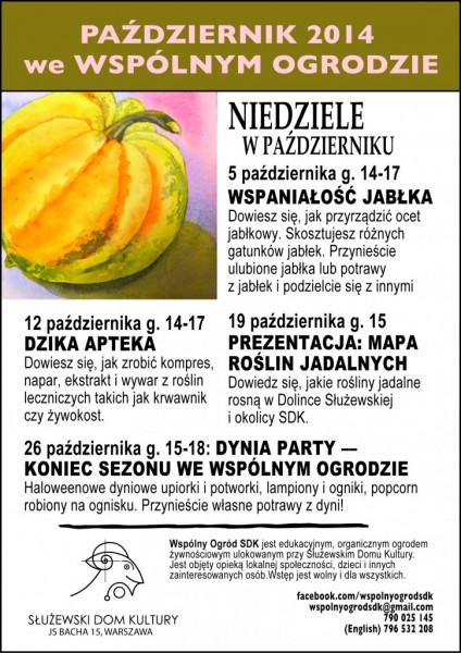 Dowiemy się jak przyrządzić ocet jabłkowy będzie można skosztować różnych gatunków jabłek. Poza tym w planie degustacje i zabawy. Otwórzmy się na innych, wszyscy przyniesiemy ulubione jabłka lub potrawy z jabłek i będziemy się dzielcie nimi z innymi. Spotkanie dla dzieci i dorosłych.A oto i pozostałe atrakcje przygotowane na październik przez Wspólny Ogród SDK:
