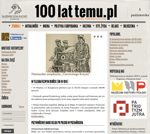 Portal 100lattemu.pl – udostępnia wybrane artykuły z polskiej prasy które zostały opublikowane dokładnie 100 lat temu (co do dnia). "Nowe" artykuły są dodawane codziennie.
