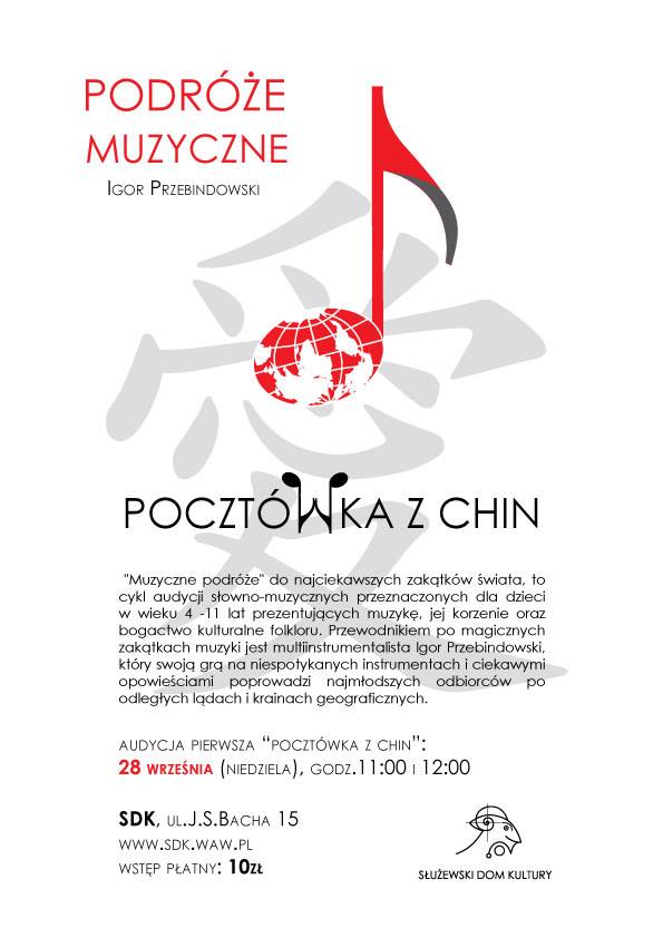 "Pocztówka z Chin" Zabawa i edukacja muzyczna w jednym. Najmłodsi słuchacze mają okazję obcować z oryginalnymi fantazyjnymi utworami z różnych stron świata. "Muzyczne podróże" do najciekawszych zakątków świata, to cykl audycji prezentujących muzykę i jej korzenie, historię i kulturę, tradycję i bogactwo folkloru. Przewodnikiem o magicznych zakątkach muzycznych jest Igor Przebindowski, który nie tylko swoją grą ale i ciekawymi opowieściami poprowadzi najmłodszych odbiorców po odległych lądach i krainach geograficznych.